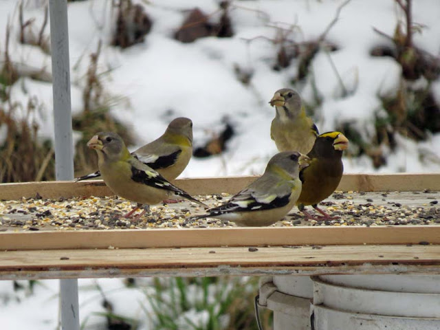 Voici un poste avec 2 silos, une mangeoire hexagonale et un plateau ajustable avec le dôme. Deux jours après son installation nos premiers chardonnerets et roselins se présentaient mais depuis, le nombre a passablement augmenté tout en accueillant de nouvelles espèces. Présentement, il y a environ une douzaine d'espèces qui nous visitent quotidiennement et le nombre de chardonnerets et roselins dépasse la dizaine. Nous avons donc autant d'oiseaux actuellement que nous en avions à la même époque à notre ancienne propriété.